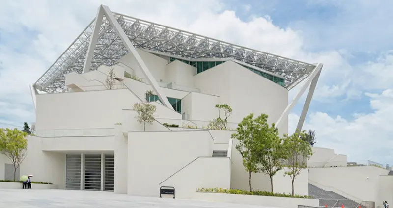 日本建築師坂茂所設計,建築本體以鳳凰花為發想概念,獨特的五角形白色建築外觀,使南美館2館成為一座象徵台南的文化地標。走進1樓大廳,挑高5層的空間採光明亮,以鋁片堆疊而成的碎形屋頂納進穿透光線,構成絕美光影。