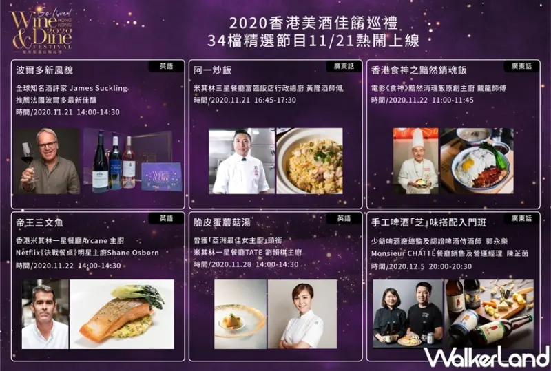 一連34場的網上大師班將會在 WineDineFestival.DiscoverHongKong.com 、從11月21日至12月6日連續三週於星期六及星期日直播。精彩內容目不暇給,包括美酒潮流、精緻料理、健康飲食及擺盤藝術。