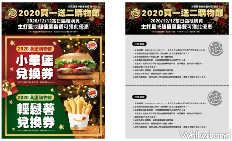 搶搭雙12的優惠熱潮,漢堡王特別在當天祭出「買一送二」的超狂優惠,只要臨櫃點購一份「主打星餐」或是「常態超值量餐」,將會直接贈送「免費兌換券」,能夠在下次前往消費時免費兌換「原味小華堡」、「輕鬆薯」,免費幫漢堡控加菜。