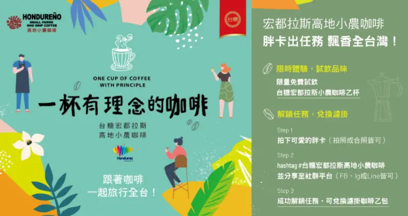 【解鎖任務,兌換濾掛】拍下可愛的胖卡(拍照或合照皆可),hashtag #台糖宏都拉斯高地小農咖啡,分享至社群平台(FB、IG或Line皆可),即可兌換濾掛咖啡乙包 (限量索取) !![]()