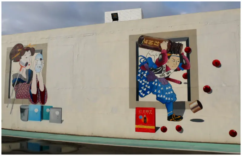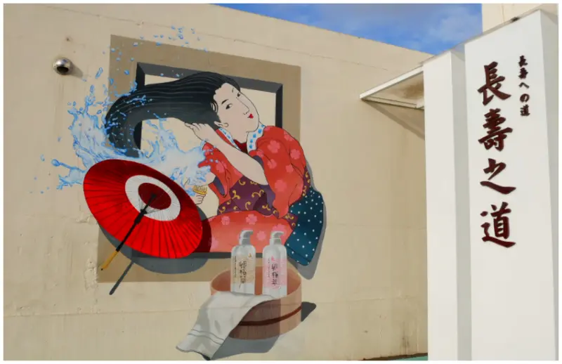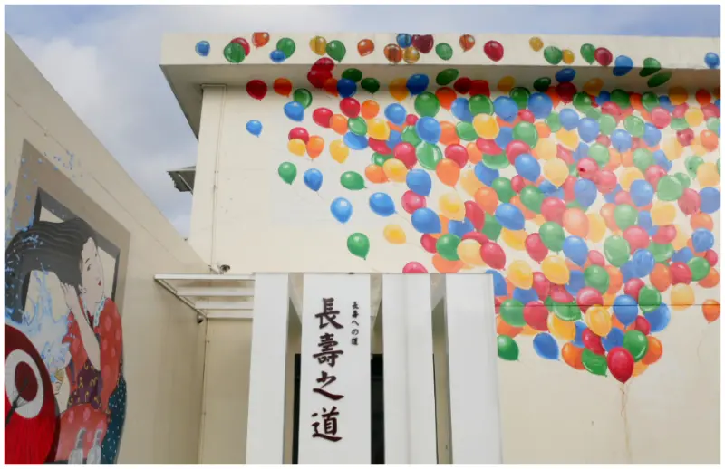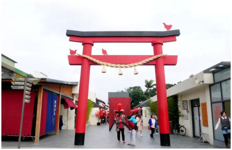 一踏入園區,即見大大的伏見、鳥居裝置迎賓,穿過鳥居,一旁江戶風十足的商店街,迎來陣陣關東煮、章魚燒的香氣,而周邊旅人正穿著正統和服穿梭其間;正中間可觸摸祈福的「長壽尊」是全台唯一、來自日本國寶藝術家馬越正八的作品;外牆大幅彩繪作品,也是旅人鏡頭下不能錯過的畫面。