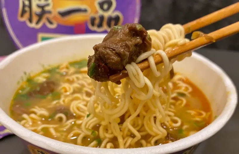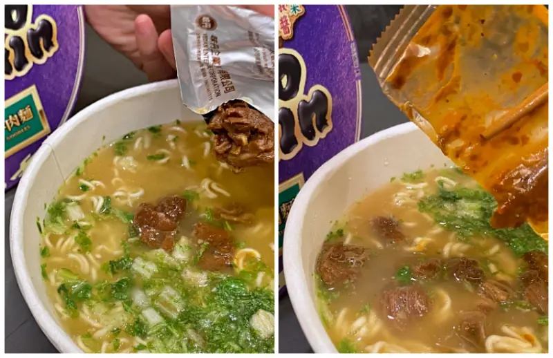 小編提供大家泡泡麵的小訣竅:蔬菜包和高湯包先和麵條一起加熱水,調理包跟酸菜包則放上碗蓋預熱,等麵條泡開後再加入麵中,能夠讓肉汁更完整的保留在牛肉塊之中,美味程度更加分!