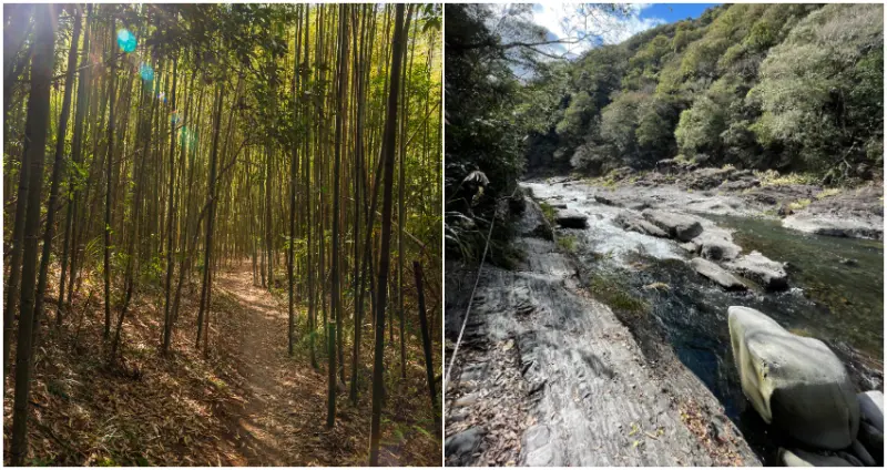 美好的事物,總是需要付出相對的代價,探訪泰岡溫泉之前,必須越山、涉水、鑽進竹林山徑中、再步行約2個小時,即可一睹被譽為「在地人秘境」的優美景致。深秋時節,一旁還有轉紅楓葉襯托著,讓綠意、藍溪再染上一抹搶眼色彩,讓人流連駐足。