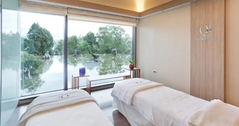 坐擁453間溫泉客房的村却,採用現代禪風簡約風格, 汲引在地純淨的碳酸氫鈉泉, 打造頂級村居美學。村却的溫泉源自羅東溪地底湧泉、清澈見底的十六份圳,曾是灌溉良田的重要水道、蜿蜒從飯店旁潺潺流過。除了碳酸氫鈉泉, 館方還導入養生湯療科技,透過專利奈米技術讓水分子對撞衝擊,產生每分鐘達