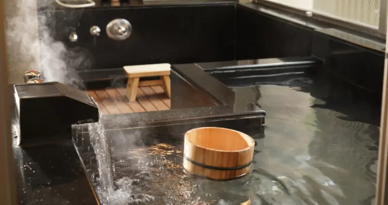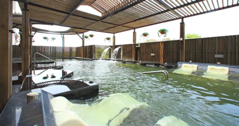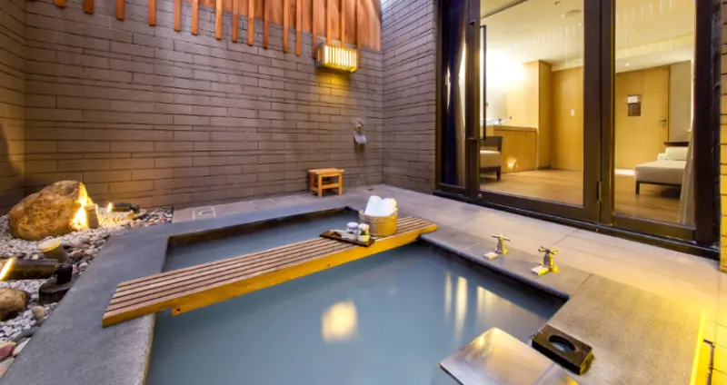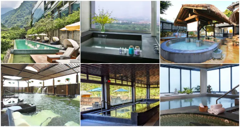 房內皆備冷熱池,以保溫效果良好的觀音石打造,45℃白磺泉搭配純淨山泉,窗外即是翠綠丹鳳山景。酒店另設露天風呂、獨立湯屋與戶外風呂, 露天風呂為裸湯,9米挑高半開放式,可享受山區徐徐微風;獨立湯屋採原木風格,具備舒適躺椅與衛浴設備;戶外風呂是著泳衣的大眾池,搭配美景與躺椅,綠意一覽無遺。