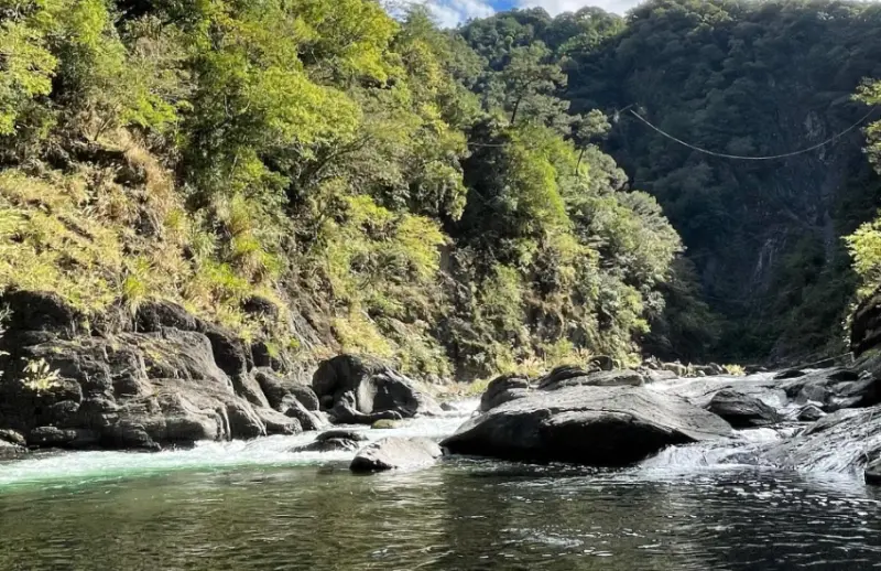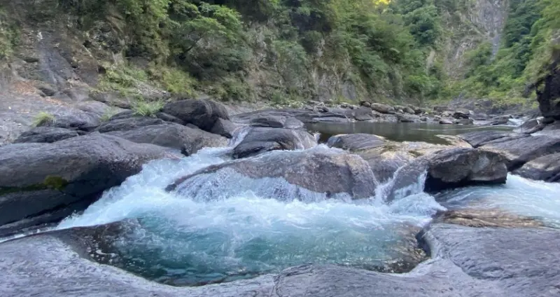 隱身於新竹縣尖石鄉秀巒部落的野溪溫泉,位處於塔克金溪下游溪谷,屬一處透明、無味的弱鹼性碳酸氫鈉溫泉,因易受沉積物堆積覆蓋,使得泉水露出狀況較為不穩,水溫約43~54℃,越是接近越可聞到淡淡硫化氫味,而周邊峽谷遍佈變質岩層,也與深潭構成了一片絕美的湛藍水面。![]()