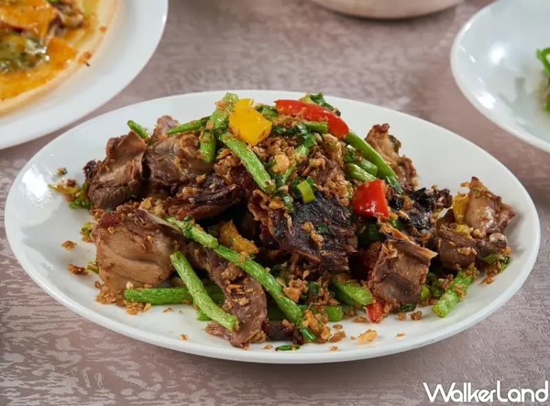 還有「碧綠椒鹽櫻桃鴨」,概念來自傳統小吃鹹酥雞,先將片過皮的鴨架骨入油鍋炸至金黃酥脆,再以蒜末、胡椒、蔥段爆香調味,依序加入紅椒、黃椒、四季豆大火快炒,油香四溢的鴨架骨吃起來清爽不油膩,與爽脆口感的彩椒及四季豆搭配的恰到好處,鹹香酥脆,吮指回味。