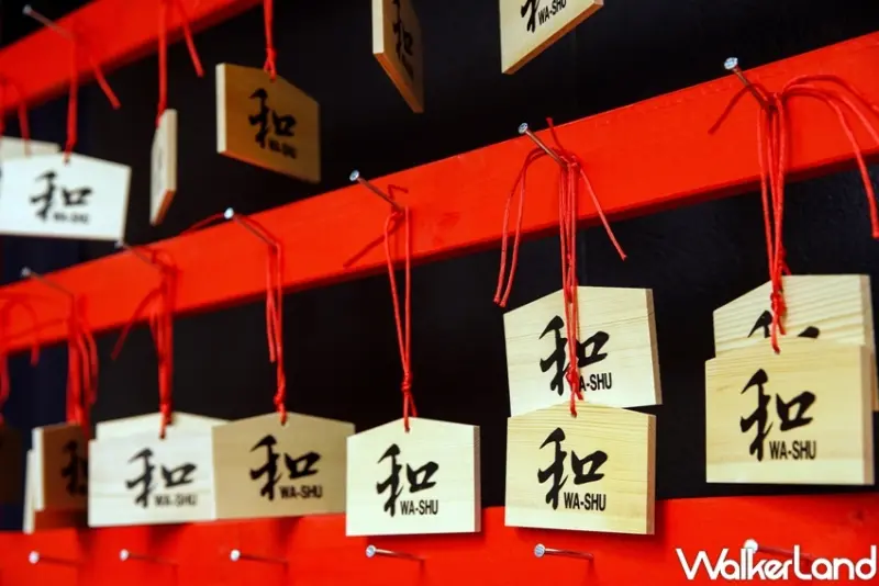 除了美味的料理之外,「WA-SHU和酒」直接把日本神社複製來酒吧,將酒吧外觀設計成鳥居,以大紅色為主軸,呼應日本的神社、鳥居。紅色象徵著生命,而鳥居作為一個「結界」劃分神界與人界,塗上朱紅色的顏料有驅魔的效果,增強守護通往神界的門,代表著濃濃祈福意味,並裝設奉納箱,還附有神社必備的手水舍,豎立的紅傘與長椅,不僅是一杯調酒,更在寒冷的冬天,為來訪的每一位消費者提供滿滿的正能量。