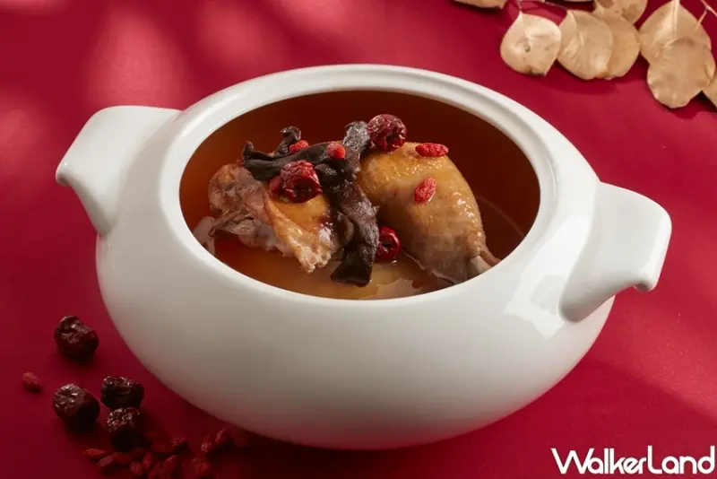 此外,過年必喝「鴻運菜脯金雞湯」,主廚特選15年熟成的陳年菜脯,與老母雞與金華火腿共同燉煮的高湯,一起以細火熬煮4小時,接著再放入桂丁雞腿一同燉煮至入味,皮彈肉嫩的雞肉,搭配口感濃郁且帶有菜脯清爽尾韻的湯頭,滋補溫潤每一個團圓時光。