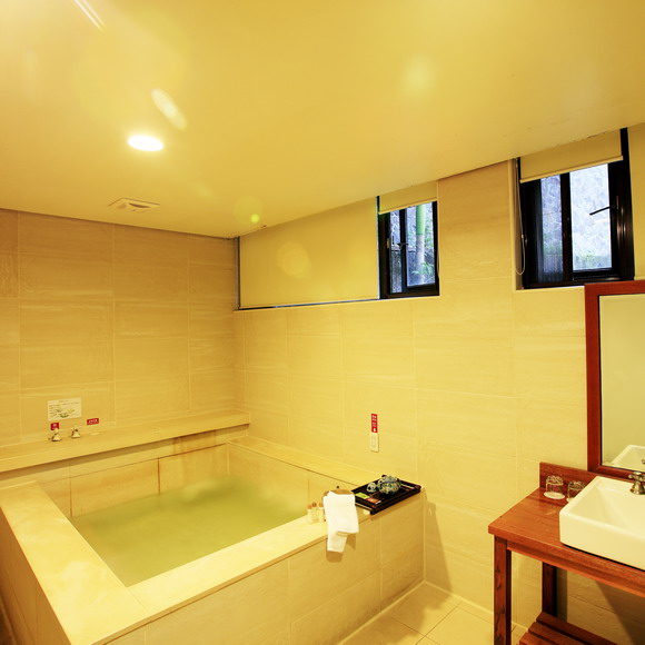 溫泉湯屋寬敞奢豪華,大片石岩片浴池注入北投在地白磺泉,沉浸於舒爽愜意的氛圍之中,優雅寬敞的衛浴空間,在獨立的私人空間卸下一身疲意,中式古質的設計,更添歷史雅韻的奢華風情。