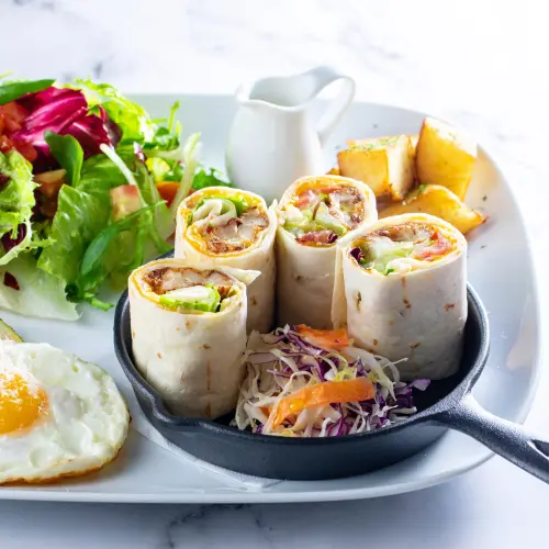 而「酪梨風味莎莎熱狗堡」以香烤過的熱狗堡抹上黃芥末,再淋上起司醬,搭配以香料、酒醋、牛番茄及酪梨製成的莎莎醬,酸酸鹹鹹的滋味,幸福感滿分;「墨西哥風味火雞肉貝果佐半熟蛋」塗上奶油的貝果烤過後外酥內軟,搭配以墨西哥香料、紅椒粉、番茄Sauce醃漬過的火雞肉,再撒上玉米餅乾脆片,一口咬下,多樣口感混搭酸甜滋味,不能錯過。
