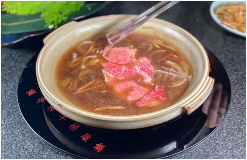 老台菜中的金錢蝦餅,也加入了和牛油去製作,成為升級版的「和牛金錢蝦餅」,酥鬆的脆皮裡咬下去盡是蝦肉的鮮味,在和牛油的襯托下,滋味更加豐富。「炙燒和牛剝皮辣椒卷佐客家桔仔醬」,口感有點像是吃鐵板燒時,用牛肉卷剝皮辣椒的那道,但因為加了客家桔醬,多了鹹酸的香氣,讓整體風味更具亮點!一向是蘭亭鍋物招牌的「蒸騰日本A5和牛沙朗」,這一季加入了花蓮赤科山的小油菊,多了淡淡的菊花香氣,讓和牛的淡雅多了一分馨香,的確是相得益彰啊!