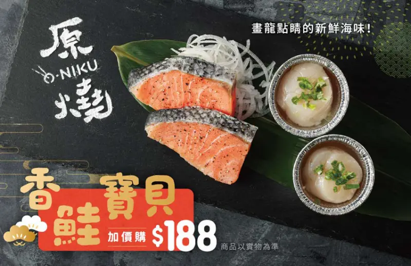 除了既有的優質肉品外,原燒O-NiKU即日起至2月16日推出「鮭魚與干貝」的加價購海鮮組合,為餐點添增更多風味!只要簡單燒烤,就能輕鬆品嚐新鮮海味。來自智利的鮭魚外酥內軟,加上來自北海道、鮮嫩多汁的烤干貝,在品嚐燒肉之餘,更能帶來畫龍點睛的口感!![]()