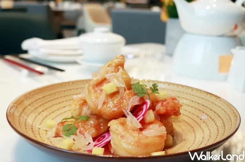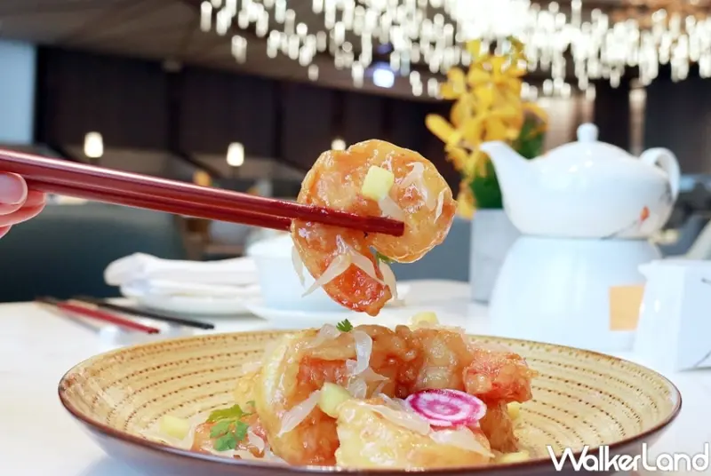 而「黃金青檸大蝦球」可口的鹹蛋黃與口感扎實Q彈的大蝦,搭配清爽的檸檬汁,看似簡單實則考驗主廚的火候技巧。天然香氣來自新鮮的檸檬果肉現榨、整顆生鹹蛋黃烘烤,炒得金黃的蝦球蝦味濃郁,視覺與味覺都是享受。