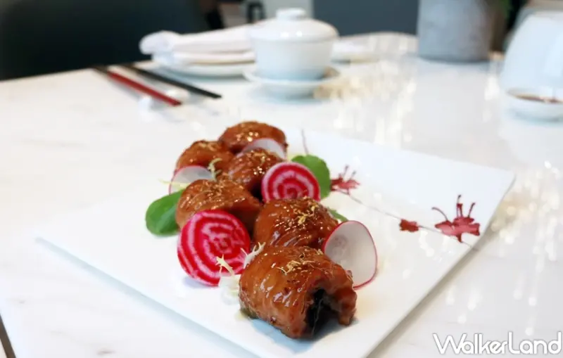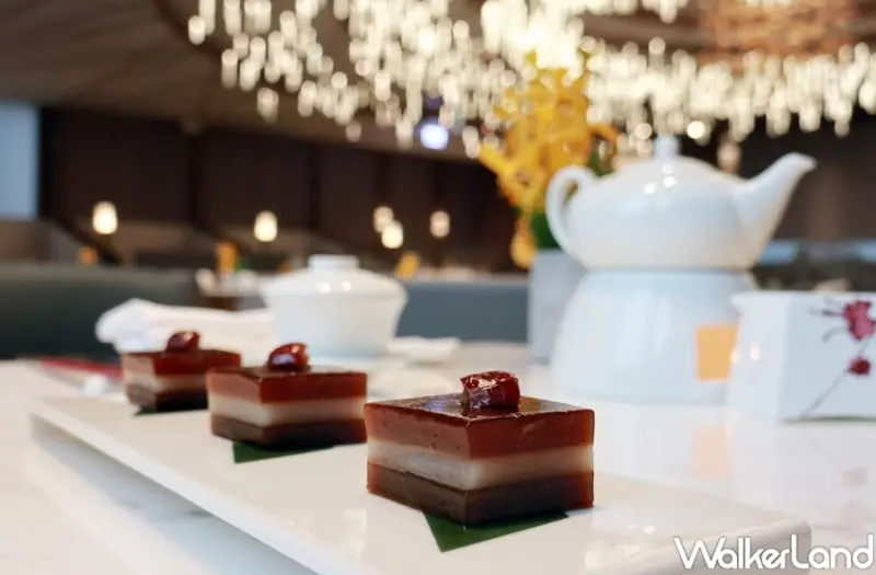 甜點方面「宮廷新疆棗皇糕」,主廚將紅棗去皮去核,只留下果肉蒸煮,再以棗汁做糕、黑糖調味,全程無添加色素或香精,天然的原味散發淡雅甘醇的香氣,口感Q彈不軟爛。