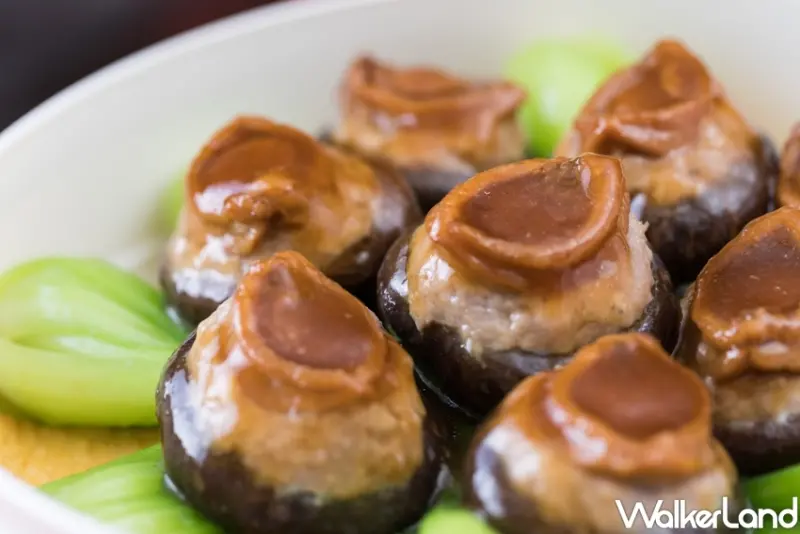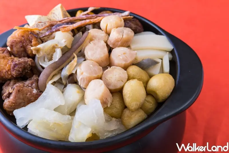 主菜「海味高湯佛跳牆」,以瑤柱、蹄筋、排骨、魚皮、魷魚、竹筍、栗子、北菇、芋頭、鳥蛋等高達10種豐富食材,將部份材料香炸過後,再將所有食材⼀併放入港式高湯中燉煮約3小時,香氣十足,料多味美。