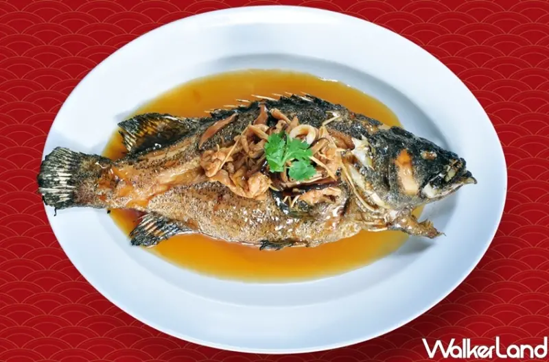 「古法三絲龍虎斑」,特選肉質扎實鮮甜的龍虎石斑,魚面先用油炸方式,使魚皮呈現香酥油脆感,再加入薑絲、豬肉、香菇俗稱「三絲」爆炒,秘製醬汁則以蒜頭、辣椒、青蔥、及其他秘製配料完美比例調製而成,最後再完整燜煮,古早味的口感讓人難以忘懷。