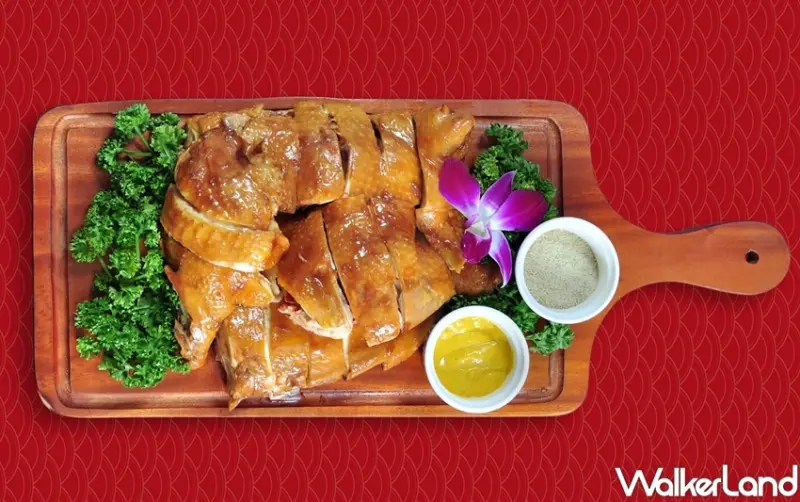 「祕製老滷玫瑰油雞」,主廚選用肉質軟嫩Q彈的土雞,浸入以鼓油為基底加入帶有酒味甘香醇厚的花雕酒、經慢火熬煮、浸泡待外皮呈現焦糖色,雞肉蘸滿甜鹹香醬汁入口更有層次。