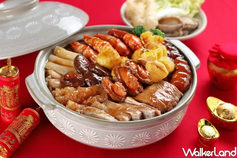 還有,高人氣年菜「港式佛跳牆」象徵幸福滿滿溢,每盅3,200元,以響螺、鮑魚、瑤柱、花膠、海參、鵝掌、金華火腿、全雞等食材搭配上湯精華,再經過8小時熬煮,每一口湯裡都能嚐到豐富的膠質以及食材鮮甜甘醇的濃郁滋味,是新春團圓宴最佳養生湯品。