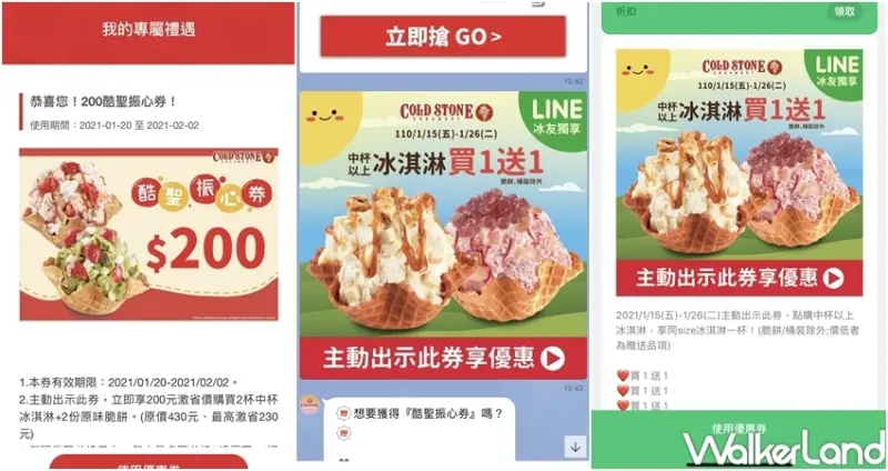 此外,COLD STONE1/20(三)首創以官方LINE發送限時「tnr」,每位酷聖石官方LINE好友即可獲得2張電子券,以「加倍送」為活動理念,於2/2(二)前主動持「200元酷聖振心券」享激省價購買2杯冰淇淋含原味脆餅(現賺230元)。