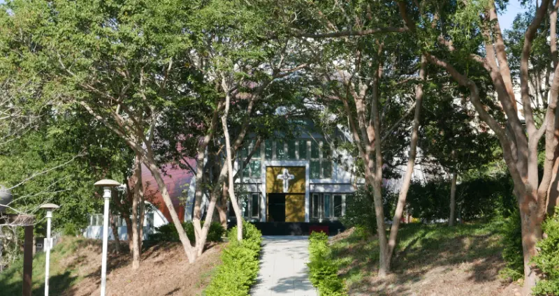 完工近1 年的「主顧聖母堂」,坐落在靜宜大學中,是台中海線的打卡夯點。教堂意為天主的家,建築意像取自聖經記述的「五餅二魚」奇蹟,自高處俯瞰有如「魚」般,而從校門口通往教堂, 其筆直之路徑更有如「永生幸福之路」,也成為婚紗拍攝新地標。由建築師洪清安設計,教堂主體由4 面弧形牆版組成,連結屋頂上方玻璃十字架,折射出不同角度的光影變化,走進其中,除了感受到莊嚴氣息,也讓人心靈沉靜。