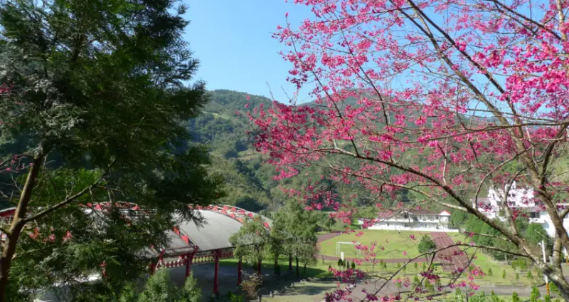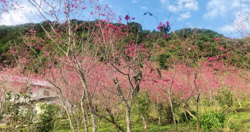 再往明池、拉拉山的方向行駛,不久便會到達「棲蘭達漾咖啡」。達漾是一家山區小餐館,種植咖啡超過20年,提供研磨咖啡、香草花茶與山產美食餐點,服務往來北橫的遊客。主人特別推薦了幾道特色餐點,包括野生山豬肉、刺蔥蛋以及現採竹筍湯等,再搭配現採香草茶、水果花茶以及特調咖啡,讓這一頓餐點豐盛又美味。今年園區的櫻花預計從2月初開到中旬,也就是在過年期間將是最盛開的時刻,沿著散步小徑邊走邊拍, 豔紅的山櫻花為翠綠山景抹上紅妝,灑落滿地的山櫻更是浪漫。因為櫻花花期不長,建議大家要把握最佳時間,才能欣賞到唯美夢幻的櫻花景致。