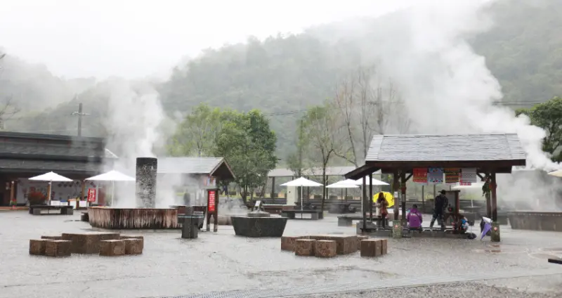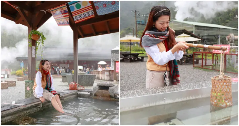 園內設置遊客中心,販售雞蛋、玉米、花生與鋁箔包香菇雞湯等食材,以及竹籠租借服務;廣場中4座煮食池與2座泡腳池,提供遊客煮溫泉美食及泡腳體驗。由於泉質關係,煮熟的玉米顏色特別鮮豔並帶些許硫磺味,風味很特殊; 溫泉蛋是最快也最簡單的料理,煮10~12分鐘拿起來泡冷水冷卻,就是好吃的溫泉黃金蛋;至於香菇雞因分量較多,建議多人一起品嚐, 很適合全家一起來玩。目前開放的2座泡腳池水溫一高一低,大約都在40℃上下,提醒大家泡的時間不要超過20分鐘。而目前新建的泡腳池與泡湯設施正在測試,預計過年期間即會對外開放營業。