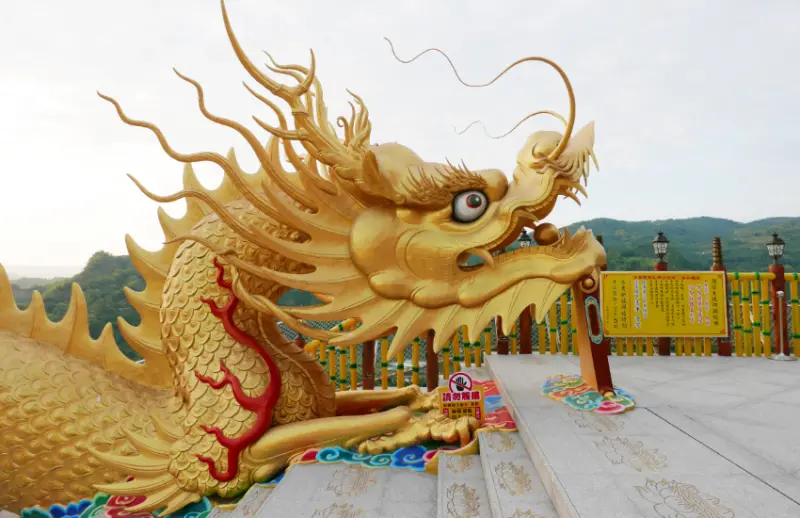 80公尺,同時也是亞洲最大、最長的巨龍雕像。金龍雕像結構以鋼筋水泥為主,細長的龍鬚則以鋼條建置,而龍頭面向法華寺,自高處眺望可見龍爪抓住樓梯、宛如巨龍使力奔往殿內的模樣,細緻的雕刻與手法,果然栩栩如生令人驚歎。寺內供奉著主神釋迦牟尼佛,寺方表示當初因佛祖指示而建造了這幅金龍樓梯,完工後不僅信眾更加絡繹參拜、香火鼎盛,也吸引了不少人前來朝聖,一睹蟠龍護天的氣勢代表之作。