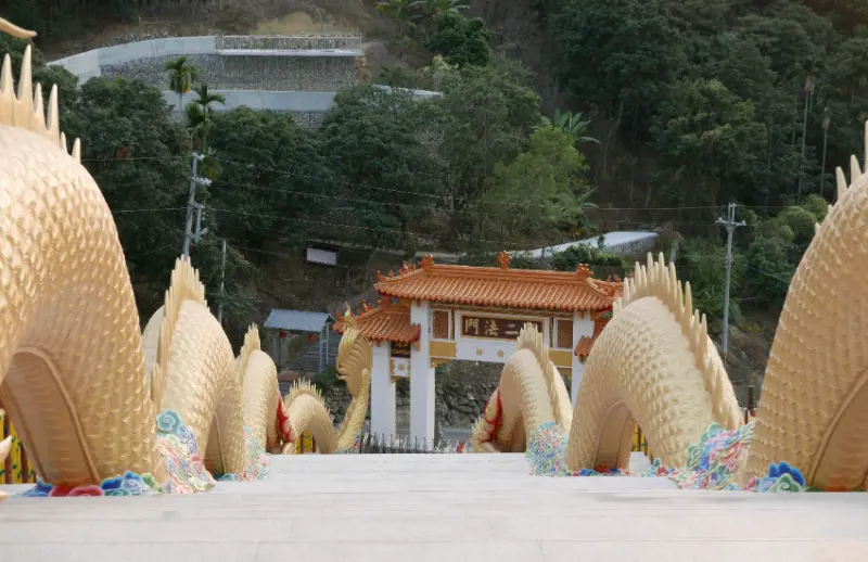 黃昏時刻,建議可特別前往中寮山區的「法華寺」,耗資千萬打造出超氣派「金龍樓梯」,樓梯兩側金龍長