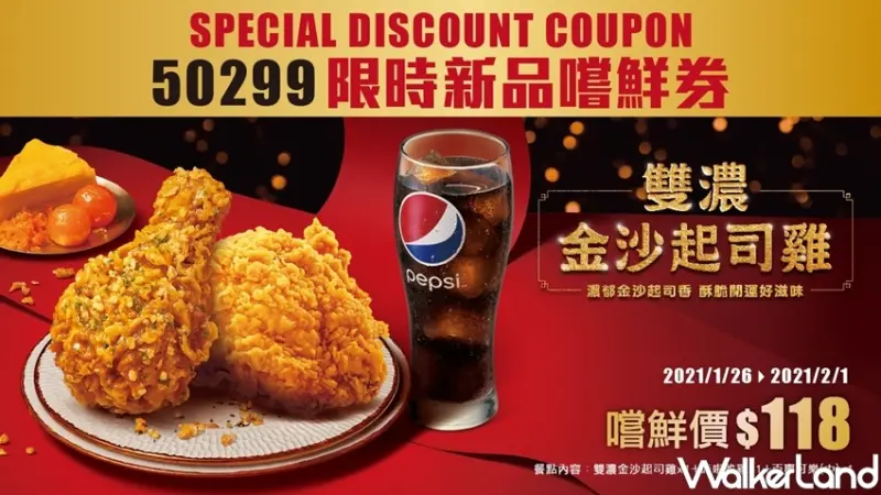 為了迎接農曆新年,台灣肯德基結合傳統台味於1月26日起至3月8日止推出限定新品「雙濃金沙起司雞」,「金」黃吸睛外觀、「富」郁香濃好夠味、「貴」氣豐盛好兆頭,為新的一年好運添好添滿。
