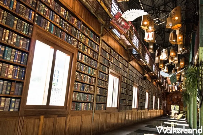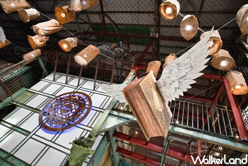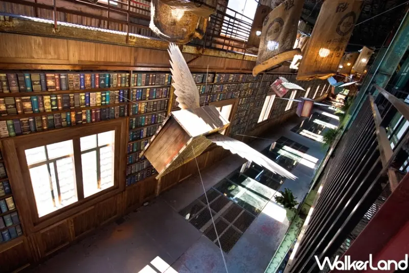 並且,在魔法工廠內共擁有3000多本純手工製作的珍貴魔法書樣形成一面壯觀的書牆,「飛天魔法書」、「魔法陣」與透明玻璃長廊及長廊盡頭「上帝的畫作」巧妙地融入刻意保留的製糖廠糖箱裝置及設備空間,美麗又神祕的鹿角蕨更是將堅硬的鐵具空間添了溫暖,是一個充滿共生共存概念既衝突又不突兀的空間設計。