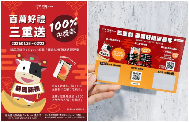 「百萬好禮三重送」活動期間從110年1月26日至2月22日止,滿額即贈新春迷最牛刮刮卡乙張,全台門市限量120萬張送完為止。超好玩的刮刮卡共有三重好禮機制: