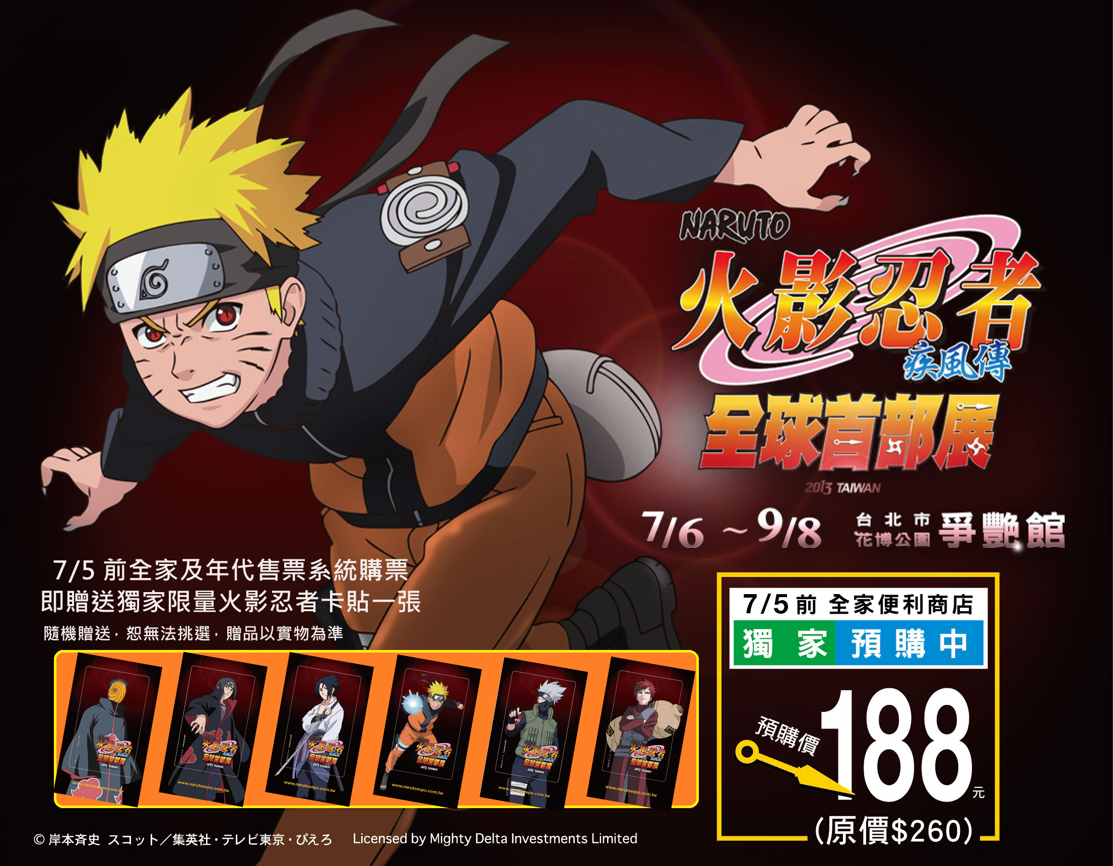 各位火影迷們有福啦!籌劃兩年、日本海外首度授權,以風靡全球的經典動畫「火影忍者」為主題的大型特展「火影忍者疾風傳全球首部展」將於2013年7月6日移師台北花博爭艷館。台北展場佔地千坪,實景打造經典場景、搭配1:1等身公仔,還有真人打扮的忍者穿梭展場,讓觀眾猶如置身動畫世界,身歷其境體驗主角鳴人的忍者之路。聽起來是不是讓人格外熱血興奮呢?