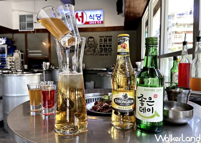 本次新村站著吃烤肉與STRONGBOW 詩莊堡聯手推出的詩莊堡蘋果系列酒品之中,首推就是「詩莊堡蘋果酒炸彈」,蘋果酒與水蜜桃紅茶的甜美搭配,加上威士忌的豐潤香氣,以及炸彈酒必備的正韓燒酒,一起碰撞出香甜熱辣的爽快滋味。