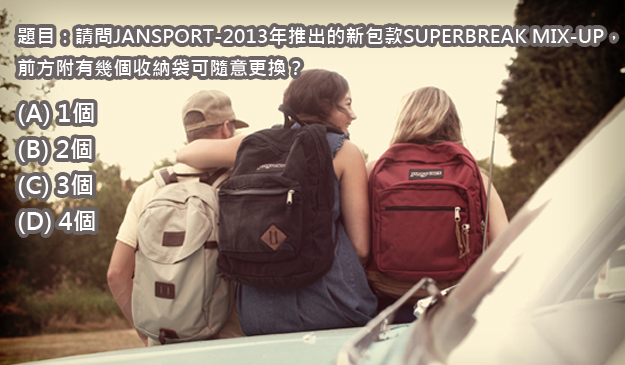 JANSPORT-2013年推出的新包款SUPERBREAK MIX-UP,有別於以往的背款,附有兩個前方收納袋可隨意更換,無論你今天是要走格紋學院風、狂野動物風、還是春夏最IN的俏麗花漾都可隨你的穿搭做改變,樣式更多變,款式更活潑,前袋也可單獨當做小提包或外出旅遊的收納袋,還具有保冷效果,既方便又實用,這麼獨特又新潮的款式就在JANSPORT,喜歡JANSPORT的你千萬不能錯過哦!