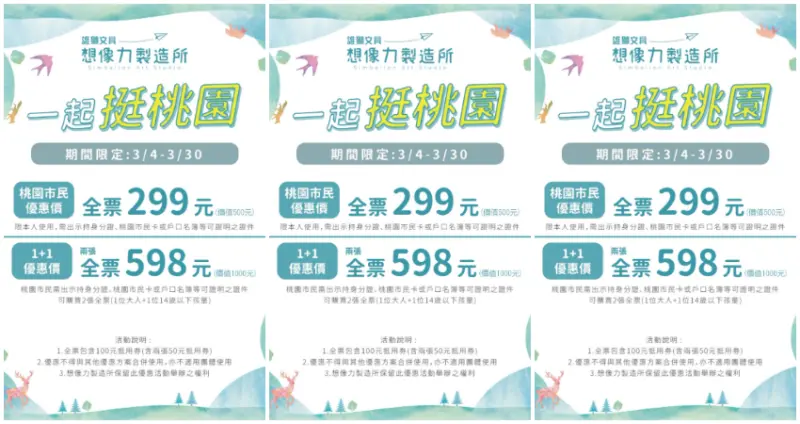 雄獅文具「想像力製造所」跟桃園一起力挺桃園!敬邀桃園市民來館遊玩,即日起至2021/03/30日止,桃園市民出示身份證、市民卡或戶口名簿證明桃園人,不分平假日,即可以享全票299元(票價價值500元)購票入館,暢玩一整天,快來館「七桃」吧! (為維護參觀品質,現場購票請配合當日入館人流管制,建議可盡早入館或先至官網http://www.simbalionartstudio.com/預約報名唷)。![]()