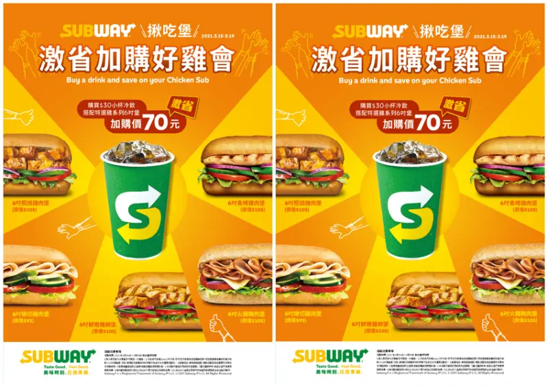 1. SUBWAY「揪吃堡」活動期間為2021年3月15日(一)至2021年3月19日(五) 各門市營業時間