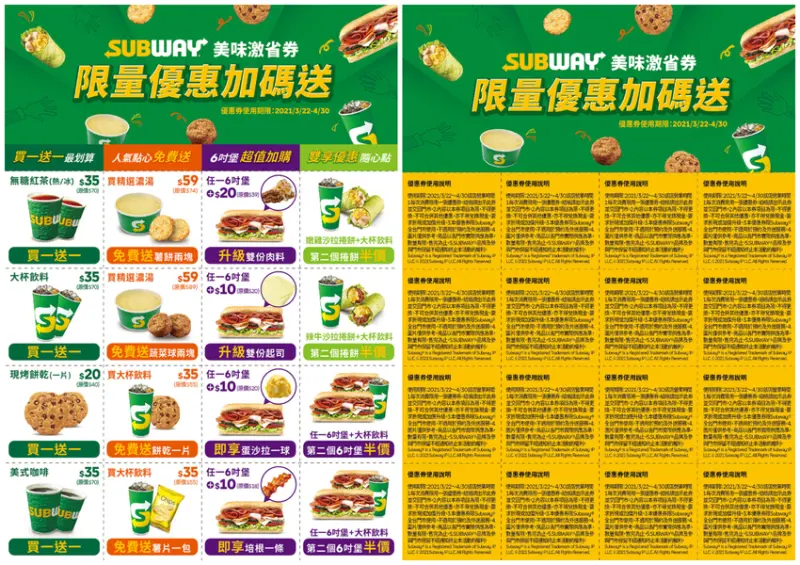 2. SUBWAY「美味激省券」使用期間為2021年3月22日(一)至2021年4月30日(五) 各門市營業時間