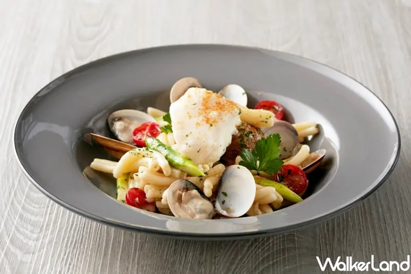 而另一款源自於南義大利西西里島的經典麵款「捲管麵義大利麵、齒魚、蛤蜊、白酒、蘆筍、烏魚子、烘製櫻桃番茄」,「捲管麵(Casareccia)」麵體表面光滑細緻,帶有許多細微毛細孔,拌炒過程中能將醬汁鎖住封存,飽足吸納蛤蜊湯汁讓捲管麵更有滋味。不僅如此,主廚特別挑選來自純淨大西洋海域的智利齒魚,其油脂豐富,肉質細嫩多汁,鮮甜滋味在口中輕盈釋放,完美演繹海洋島國風情。