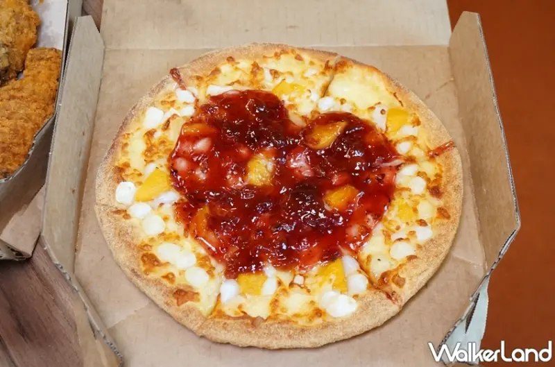 達美樂全新推出的「草莓甜心披薩」,選用無負擔的9吋紐約餅皮上,均勻撒滿麻吉丁、水蜜桃果粒和香濃的莫扎瑞拉起司等配料,進爐烘烤完成過後,在使用來自法國的百年品牌草莓醬,精心描繪出愛心圖樣,並強調天然、不含色素香精及防腐劑,能夠吃得安心,不但外型搶眼,更有香甜濃郁口感。