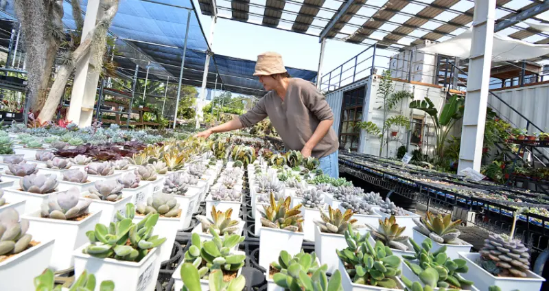 田尾花農和樹農世代相傳,張鑫源是第四代經營者,家中以種植大型及景觀植栽為主,卻因為太太段書農喜歡多肉植物而開闢了另一番天地。綠果庭院的規模從一開始的門口小花架,到現在600坪上萬盆的綠果庭院;從單純培植,到成為遊客賞景DIY、網紅打卡熱點,夫妻倆全心投入園藝成果豐碩。![]()