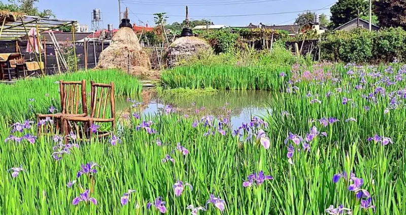 住宿區以烘稻間、古亭畚、生態池,以及高聳樹林構築成簡單自然的環境,溫馨的住宿空間有交誼廳、泡茶區和簡便的床鋪,膽子稍大的可以攀上數米高的竹梯住在小閣樓上。而身處花鄉田尾,成哥也選擇截然不同的花卉植栽,以少見的鳶尾花為主角,打造約800坪的中部唯一鳶尾花海景觀,4、5月花開時田中一片紫、白、黃、紅、粉等色彩,令遊客如徜徉在梵谷名畫的繽紛花海中。