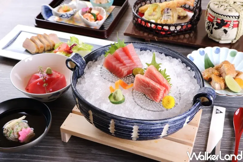 中山日本料理廳藍文彬主廚為喜歡品嚐甘鮮凝脂、清爽細膩鮪魚料理的人,以他最擅長的生食日料手法,推出「鮪魚會席料理」,豐富內容包含「和風開胃前菜」、「生魚片」、「酥炸鮪魚天婦羅」、「香煎鮪魚排佐沙拉」、「鮪魚丼飯」與「鮪魚蔥真丈清湯」,中間並以「酥烤土雞肉佐檸檬」讓味蕾稍事休息,最後再用時令「春梅果凍」及「什錦水果盤」為一餐畫下美好句點。