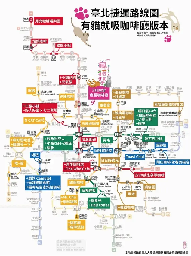 本次瘋貓祭特別針對台北捷運淡水線、新店線、內湖線、板南線、南勢角蘆洲線,五條捷運沿線,整理出39間「有貓就吸」貓咪咖啡廳。