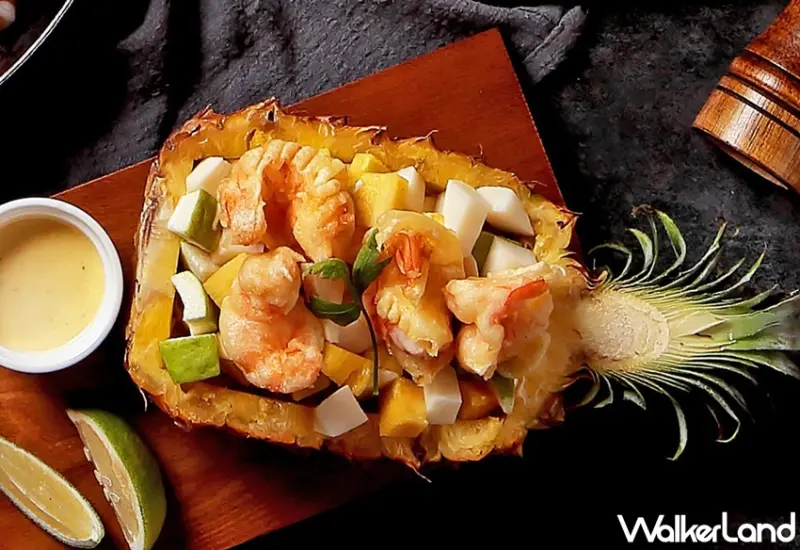 首先,金色三麥餐廳的部分特別推出半顆鳳梨端上桌的「乘鳳破浪松子炒飯」,以烘烤手法濃縮鳳梨果香以及松子堅果氣息,大火炒進剝皮辣椒丁、豆腐丁、杏鮑菇丁,打造豐富口感的五辛素炒飯,另一款「夏威夷鳳梨沙拉」則是搭配鮮美的海鮮以及新鮮在地水果,拌上主廚特調鳳梨沙拉醬,清爽的風味最適合當作開胃菜。