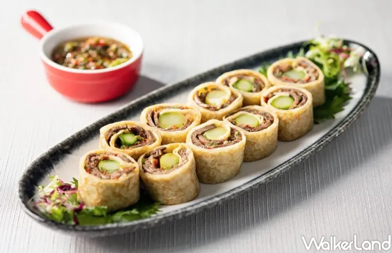此外,「風味牛肉捲」以薄蛋皮將牛腱肉薄片與蘆筍捲起,並切成適合入口的完美大小,一次能品嘗到蛋皮的柔嫩、牛腱的多汁與蘆筍的鮮甜,沾取以青辣椒、紅辣椒特製的辣醬,香麻滋味充滿口腔,令人意猶未盡。