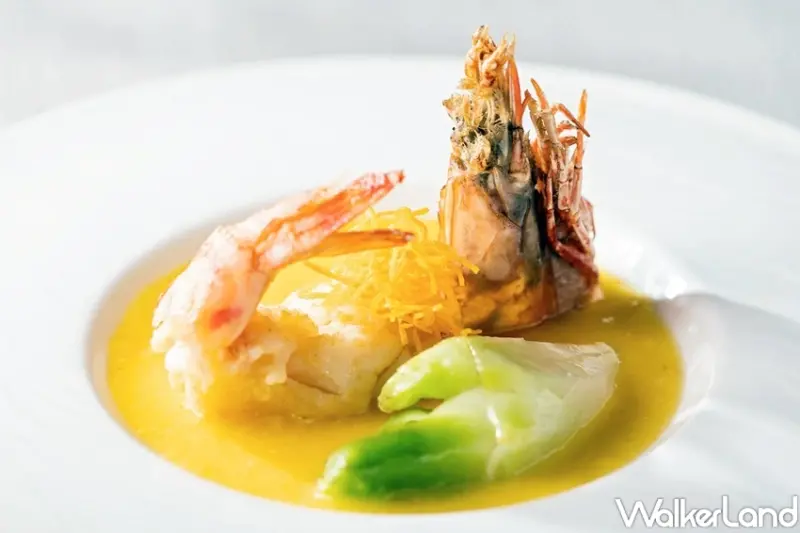 蝦料理「金湯煎明蝦」嚴選肉質細緻的明蝦,香煎後不做任何調味,浸於以新鮮玉米、小麥與朝天椒製成的金黃醬汁中,一入口,味蕾瞬間被明蝦彈牙多汁的口感驚艷,細細咀嚼後浮現出朝天椒的辛辣後勁,一口接著一口,停不下來。