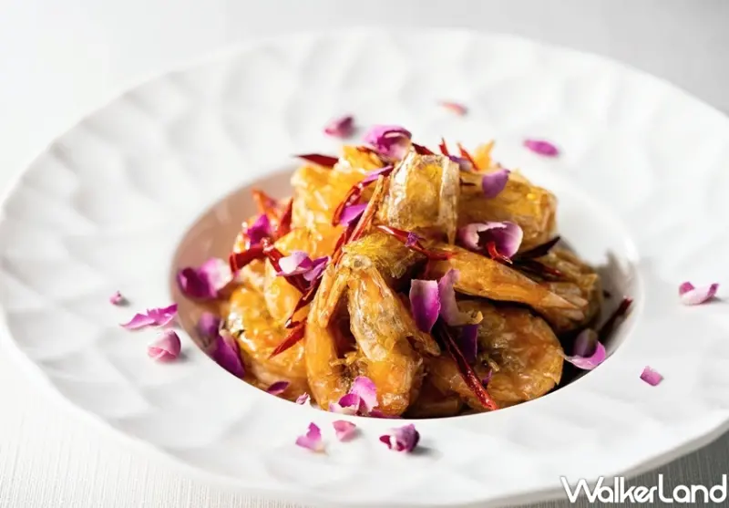 而「玫瑰芥香蝦」,主廚將蝦肉炸至酥脆後與鮮新玫瑰花瓣、蜂蜜、美極醬與芥末油拌炒,美極醬牽引出蝦肉本身的鮮甜,而芥末油的香辣則挑起食慾,令人忍不住一口接著一口品嚐。