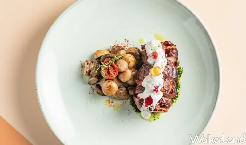 餡料奶油青蘋果則是以奶油慢火熬煮,將蘋果的酸澀與青甜巧妙結合,包入桂丁雞腿肉成捲後慢火嫩煎,再搭配經典配菜炒磨菇,最後點綴分子料理手法製成的椰奶泡,將椰奶的濃郁風味以泡沫形式展現。底層鋪上新鮮菠菜泥,喜歡清爽口感的老饕們絕對會喜愛。