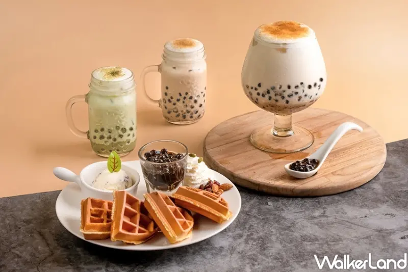 其中帶有琥珀色澤的「黑糖珍珠拿鐵」,口感滑溜Q彈,濃濃香甜的黑糖味,混和濃郁豐厚的牛奶,上層疊加質地光滑、蓬鬆綿密的雲朵奶泡,口感圓潤濃醇,清爽不膩口。濃郁銷魂的「抹茶珍珠拿鐵」,白玉珍珠清新香甜,牛奶的醇美搭配微苦抹茶,香氣厚實飽滿。「冰淇淋珍珠鬆餅午茶組」以外酥內軟的格子鬆餅堆疊沁涼香草冰淇淋及滑溜黑糖珍珠,層次豐富。